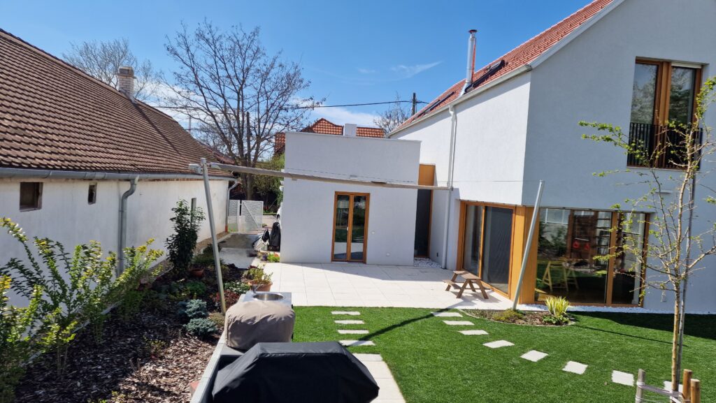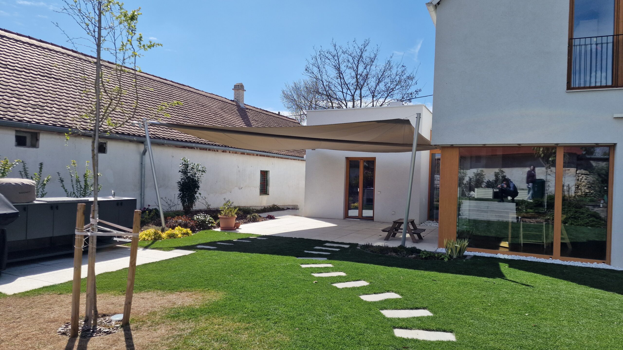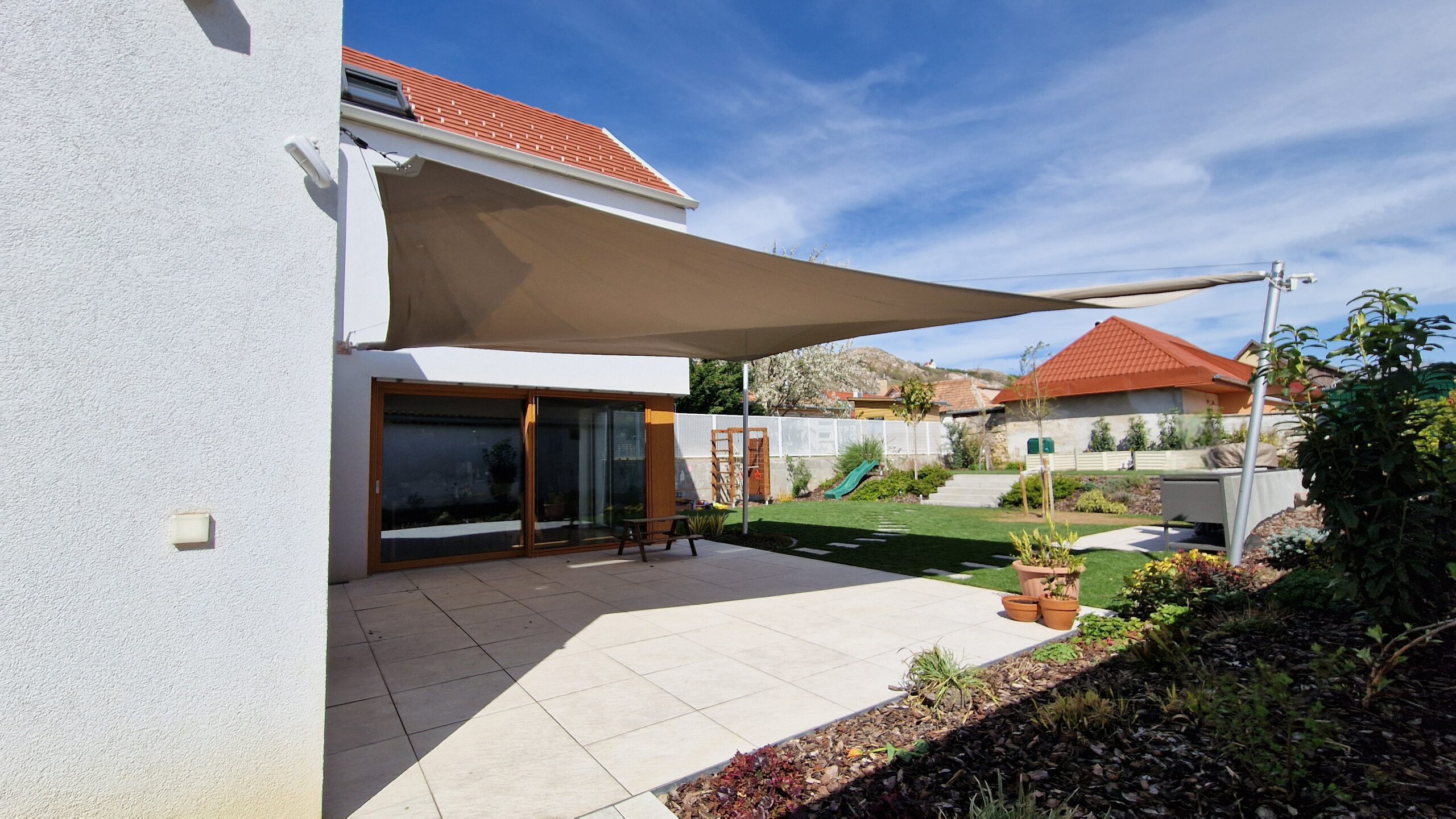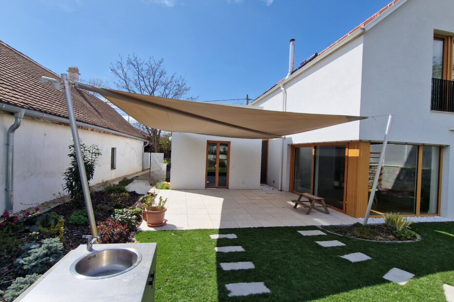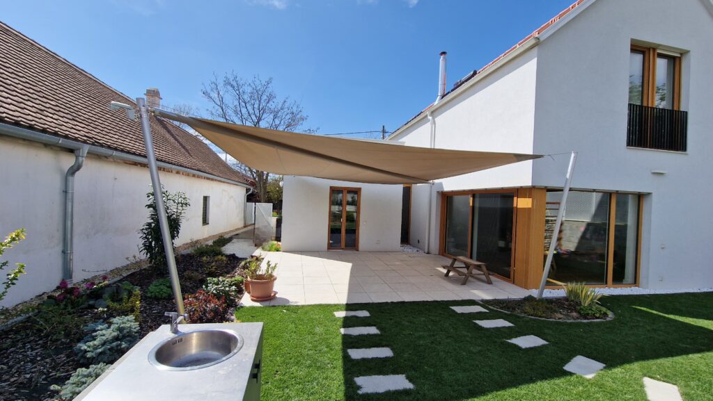 Ezen projektünkön egy udvart tettünk jobban kihasználhatóvá a nagy felületű árnyékolással. A rendszer rugalmasságának köszönhetően két oszloppal és két fali rögzítéssel szereltük fel a napvitorlát, vízálló szövettel, így enyhe esőben és napsütésben is jól használható az alatta lévő terület. Az oszlopokhoz szükséges beton alapokat utólag a kert elemeivel tették szinte láthatatlanná.